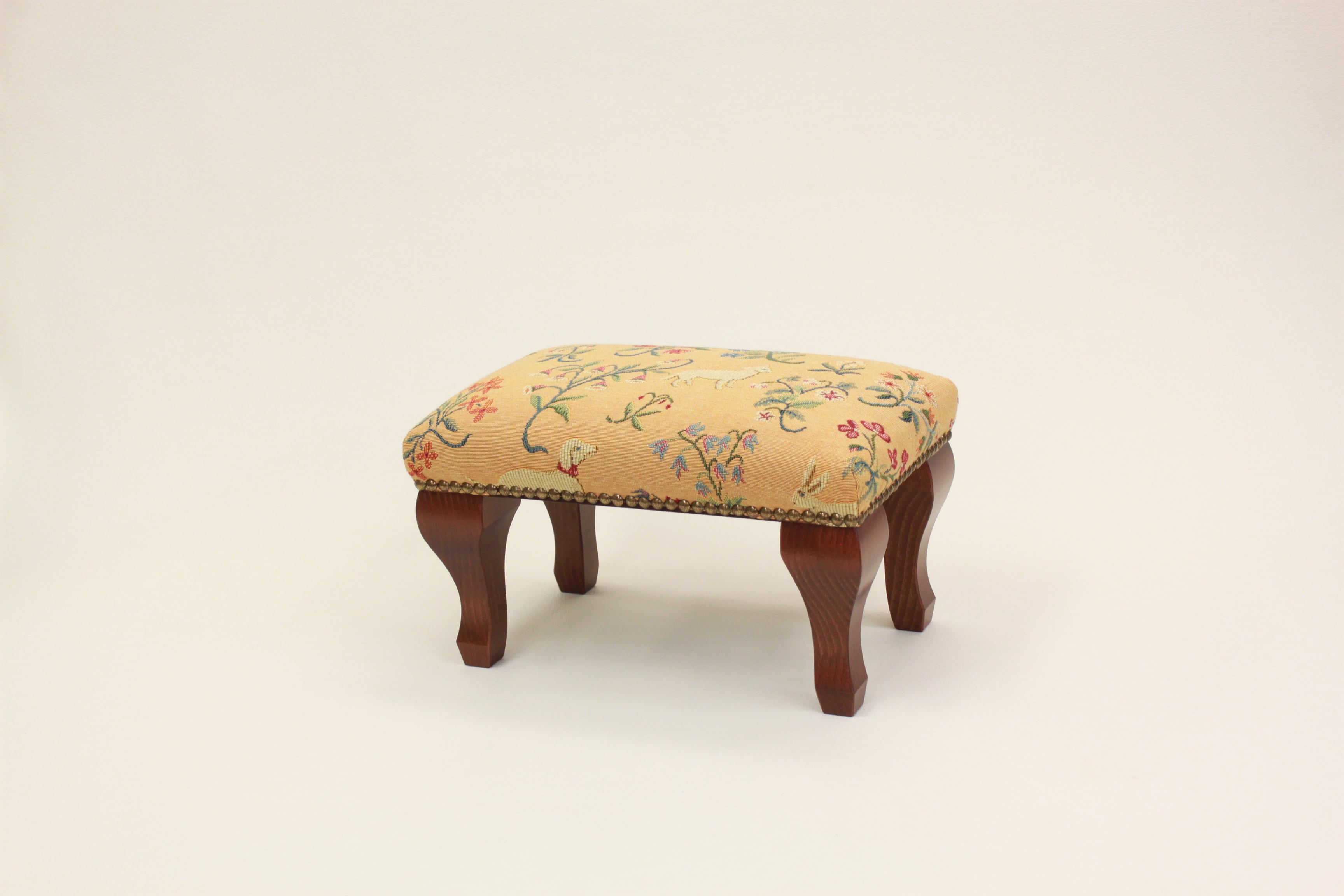 スツールは全て日本製。木枠、塗装、張り込みと日本の3人の職人の手によって作られています。 木部=脚は可愛い猫脚削り出し。 塗装=塗装色は木目を生かし、濃い茶色。 椅子張り=釘を一切見せず、細部にまで神経を使って綺麗に仕上げています。 布地=フランス製。 直輸入しているので他では手に入らない生地を使用しています。 フランスの生地は発色がよく、色鮮やかでお部屋に合わせやすいです。