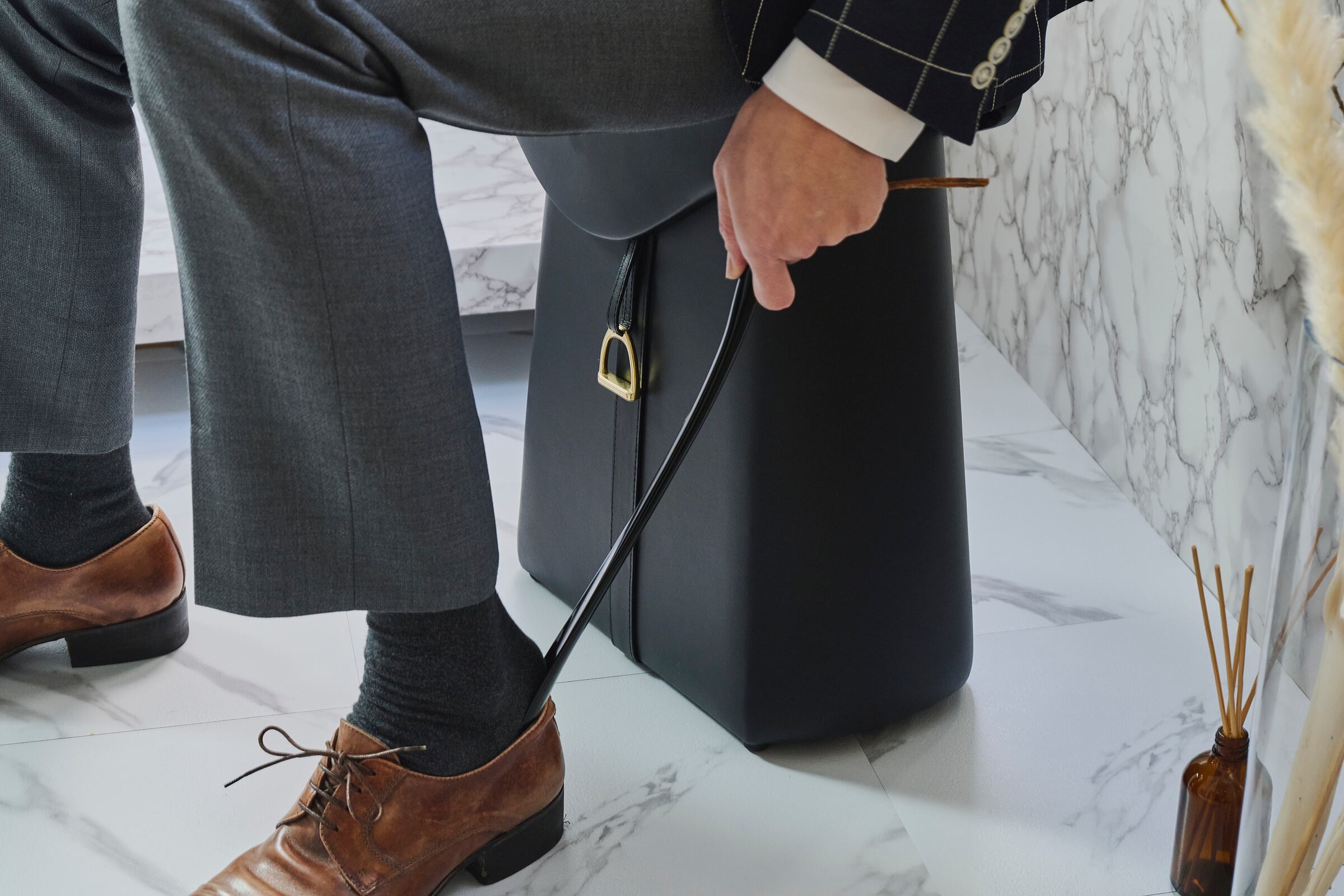 “The Art of Upholstery Rooted in Equestrian Craftsmanship—A Touch of Elegance for Your Entryway.”The history of Tokyo’s upholstery craftsmanship traces back to equestrian gear-making, where artisans skilled in working with leather passed down their techniques to the art of upholstering chairs. This stool embodies that heritage, showcasing a refined design infused with tradition. Made from premium full-grain leather, it develops a rich patina over time, offering a tactile experience that only improves with use. Whether for putting on or caring for your shoes, it transforms everyday moments in your entryway into something special. A piece that welcomes you home with elegance and sophistication.