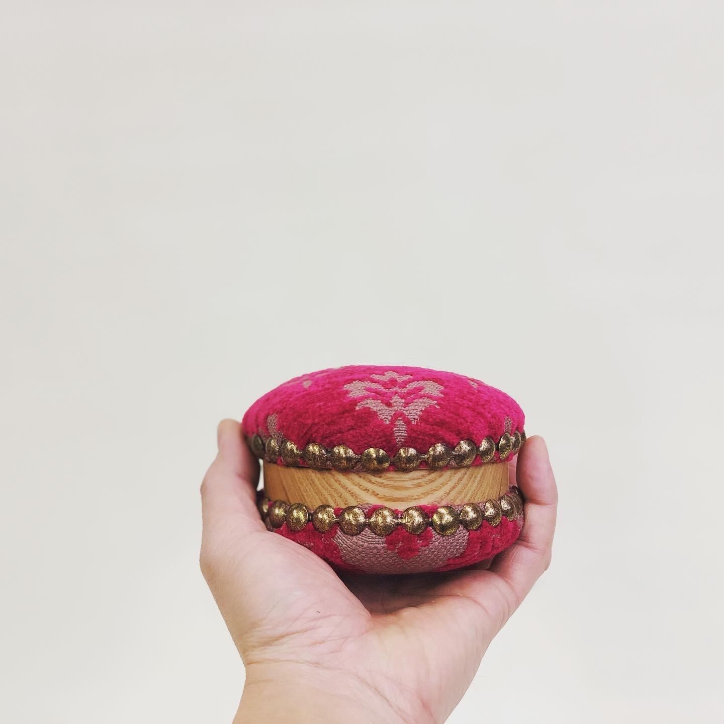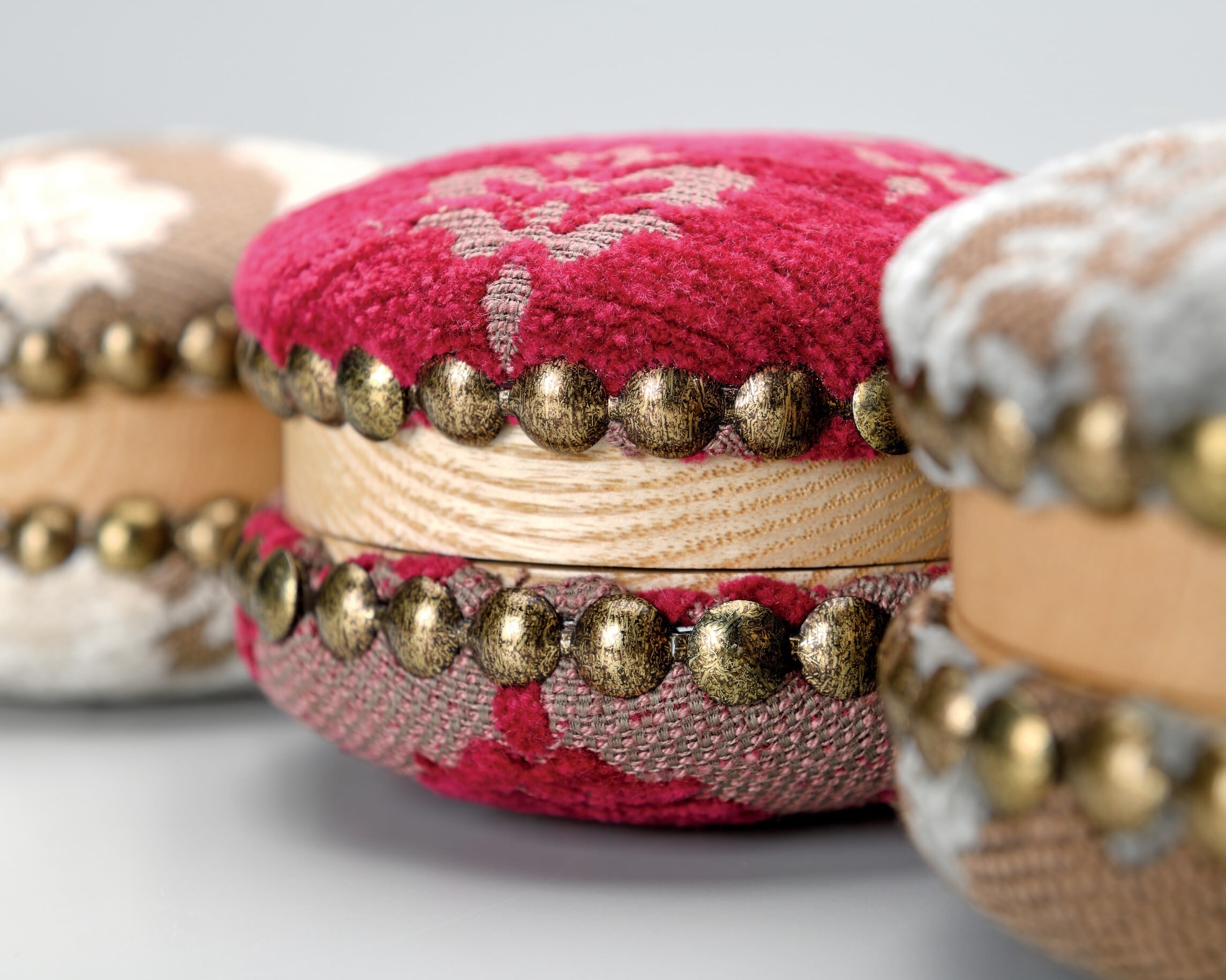 Inspired by the traditional French pastry, the macaron, this case is crafted using upholstery techniques.