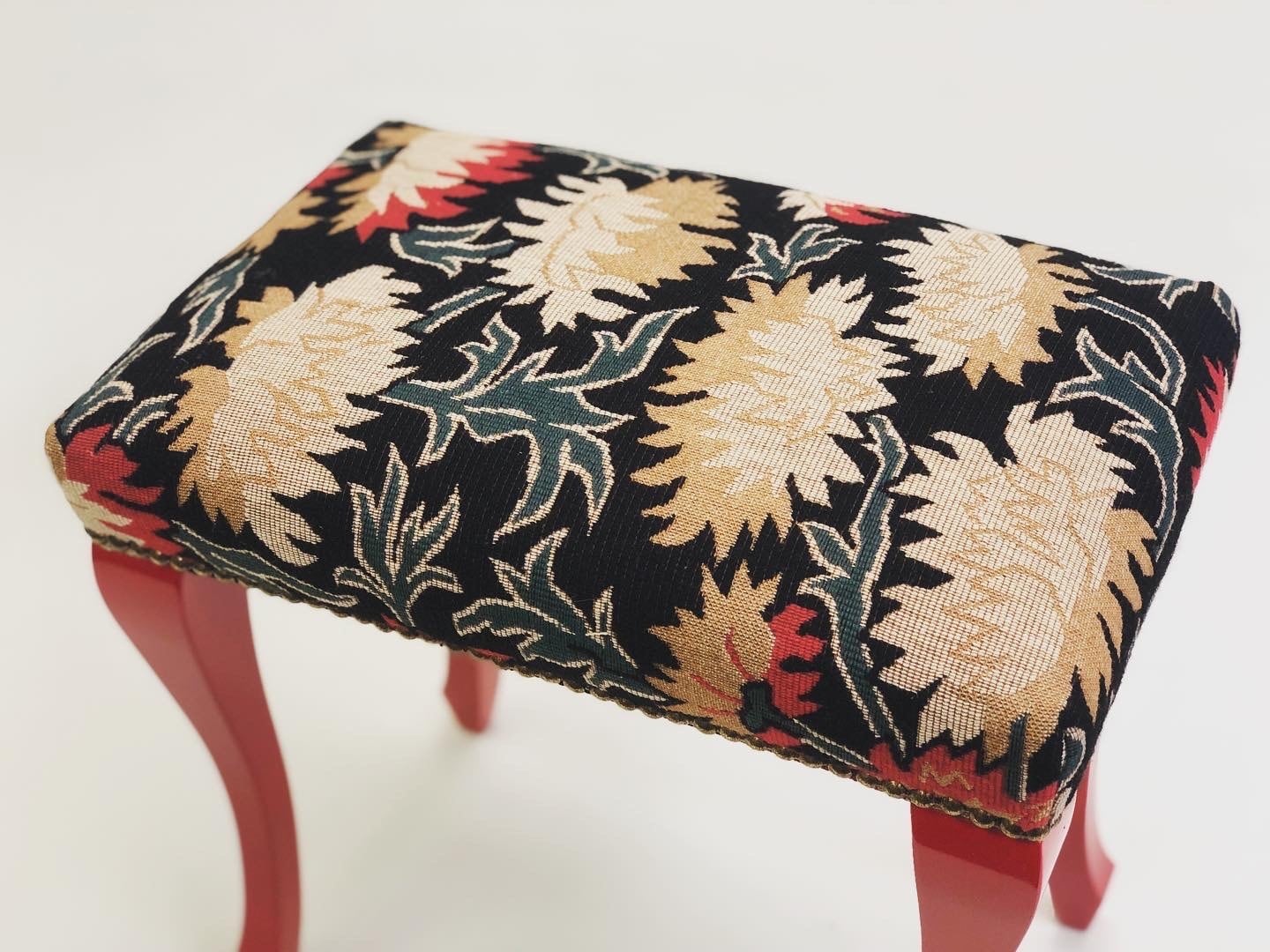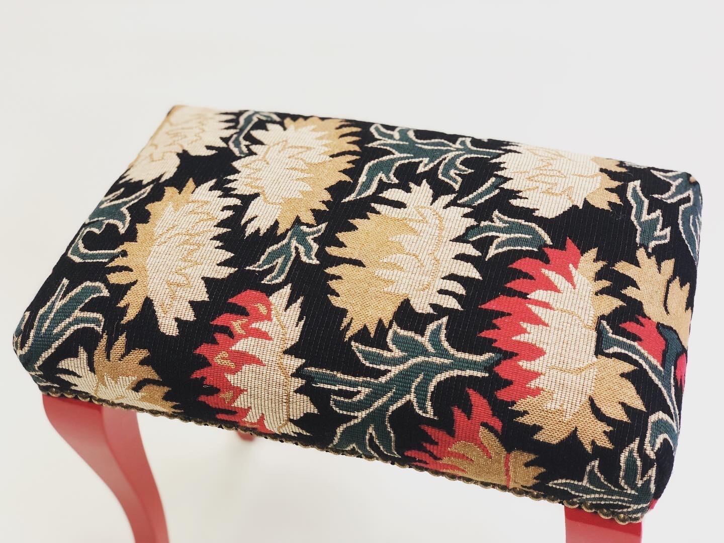 漆調の朱色(赤)が玄関をおしゃれに彩る、イスハウスの玄関スツールプティ。フランス直輸入の厚地のしっかりした生地で作られ、安定感があります。
